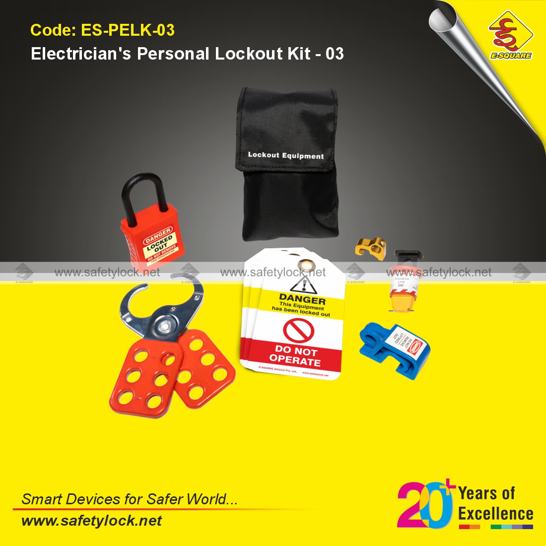 The E-Square Personal Electrical Lockout Kit – 03 is an electrician’s personal lockout kit. It contains devices that an electrician will require to safely and securely carry out a job. All components are packed in a mini waist pouch with a belt loop for electricians to carry the items at the site easily.